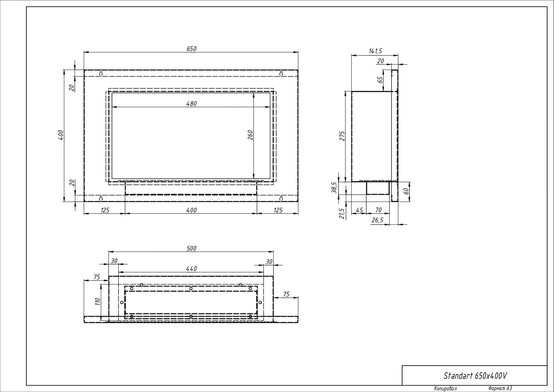 Встраиваемый биокамин «Модерн 650V» изготовлен из стали и нержавеющей стали, окрашен термостойкой порошковой краской.