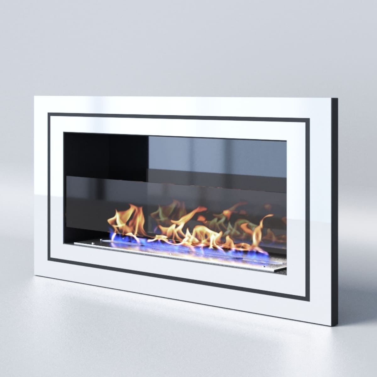 Декоративное стекло — крепится на всю заднюю стенку очага. За счет своего зеркального отражения, пламя визуально становится в 2 раза больше и кажется, что камин горит еще ярче.